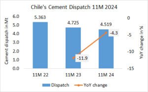 Argentina’s annual cement dispatch in 2024 declined by -23.9% to 9.555 Mt, after 12.557 Mt in the last year and 12.976 Mt in the 2022.