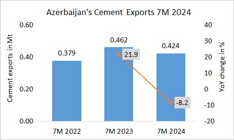 In the first 7 months of 2024, Azerbaijan’s cement exports declined by -8.2% to 0.424 Mt, after 0.462 Mt in the same period last year and 0.379 Mt in the year before.