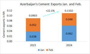 In the first 2 months of the year, the cement production in Azerbaijan increased by +29.8% to 0.547 Mt, after 0.421 Mt in the same period last year. In January the production increased by +23.2% YoY, while in February the production even increased by +36.0% YoY.