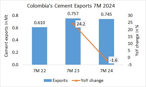 In the first 7 months of 2024, Colombia’s cement exports declined by -1.6% to 0.745 Mt, after 0.757 Mt in the same period last year and 0.610 Mt in the year before.