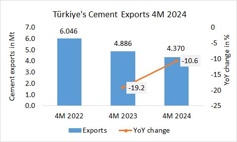 In the first 4 months of 2024, Türkiye’s cement exports declined by -10.6% to 4.370 Mt, after 4.886 Mt in the same period last year and 6.046 Mt the year before.