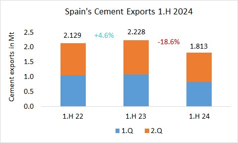 In the first half of 2024, Spain’s cement production declined massively by -18.6% to 1.813 Mt, after 2.228 Mt in the same period last year and 2.129 Mt the year before.
