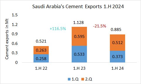 In the first half of 2024, Saudi Arabia’s cement exports declined by -21.5% to 0.885 Mt, after 1.128 Mt in the same period last year and 0.521 Mt in the year before.