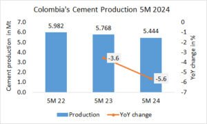 In the first 5 months of 2024, Bolivia’s cement production increased by +5.5% to 1.617 Mt, after 1.532 Mt in the same period last year and 1.498 Mt in the previous year.