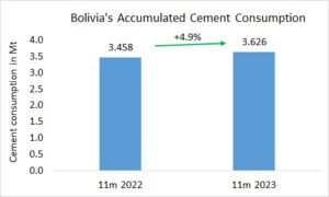 In Bolivia, from January to November 2023, the cement production increased by +2.9%, YoY to 3.635 Mta, after 3.532 Mt in the same period the year before. In November the production increased even +16.4% YoY to 0.359 Mt.