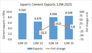 In the first month in 2026, Brazil’s cement dispatch increased by +1.1% to 5.266 Mt, after 5.209 Mt in the same period last year and 4.921 Mt in the year before.