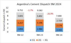 In the first 9 months of 2024, Brazil’s cement dispatch increased by +3.8% to 48.738 Mt, after 46.955 Mt in the same period last year.
