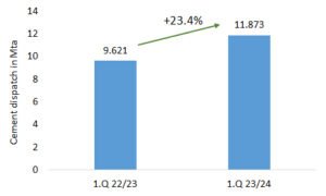 In the 3.Q 2023 (July to September) the cement dispatch in Brazil declined by -1.4% to 16.7834 Mt, after 16.957 Mt (3.Q 2022). The accumulated cement dispatch in 2023 declined by -2.0% to 46.678 Mt, while the cement consumption declined by -1.7% to 46.678 Mt and the exports declined by -46.6% to 0.168 Mt.