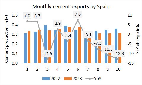In Spain, from January to October 2023 the accumulated cement exports declined by -2.9% to 3.406 Mt, from 3.508 Mt in the same period in 2022. However, a large YoY decline has been in the least 3 month with -7.3%, -10.5% and -12.8%, respectively. In these last 3 month 0.937 Mt have been exported compared to 1.044 Mt in 2022, which results in a -10.3% YoY decline.