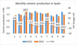 In Spain, from January to October 2023 the accumulated cement exports declined by -2.9% to 3.406 Mt, from 3.508 Mt in the same period in 2022. However, a large YoY decline has been in the least 3 month with -7.3%, -10.5% and -12.8%, respectively. In these last 3 month 0.937 Mt have been exported compared to 1.044 Mt in 2022, which results in a -10.3% YoY decline.