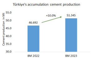 In the first 8 month of 2023, the accumulated cement exports of Türkiye decreased by -16.8% to 10.601 Mt from 12.735 Mt in the same period a year ago. The cement exports in August even decreased by -47.0% to only 0.947 Mt from 1.768 Mt in August 2022.