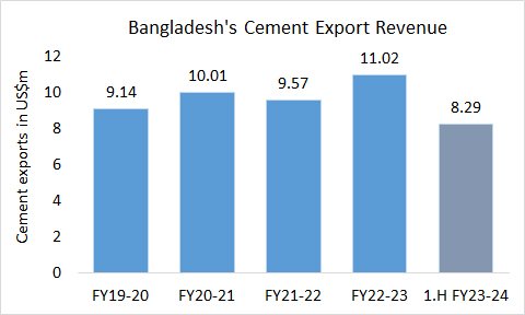 In the first half of FY 2023-24 (period from July to December 2023) the cement export revenue of the cement exporters in Bangladesh increased by almost 50% to 8.294 US$m. This comes after a YoY increase of 15.2% in the last two financial years.