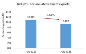 From January to July 2023 the cement production of Türkiye increased by +9.2% to 43.658 Mt, after 39.972 Mt in the same period last year. After 6 month the production increase has been +7.6%, YoY.