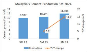 In the first half of 2024, China’s cement production declined by -12.8% to 854.65 Mt, after 9.79.68 Mt in the same period last year and 978.96 Mt the year before. In June the production declined by -11.4% YoY to 163.97 MT.
