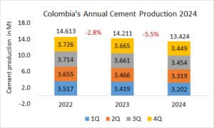 The annual cement exports by Colombia declined by -0.2% to 1.314 Mta, after 1.317 Mta in the last year and 1.108 Mta in 2022.