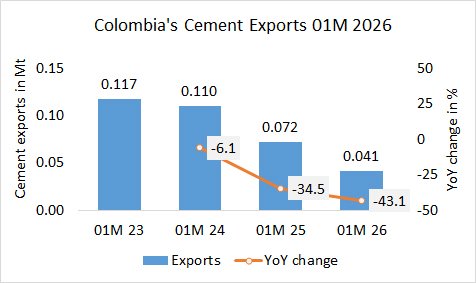 In the first month in 2026, Colombia’s cement exports decreased by -43.1% YoY to 0.041 Mt, after 0.072 Mt in the same period last year and 0.110 Mt in the year before.