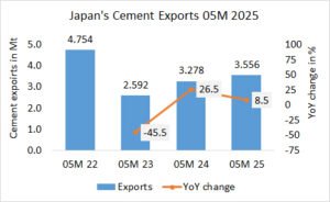 In the first 5 months in 2025, Colombia’s cement exports declined by -9.7% to 0.455 Mt, after 0.504 Mt in the same period last year and 0.504 Mt in the year before.