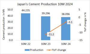 In the first 10 months in 2024, Colombia’s cement production declined by -5.5% to 11.158 Mt, after 11.808 Mt in the same period last year and 12.135 Mt in the year before.