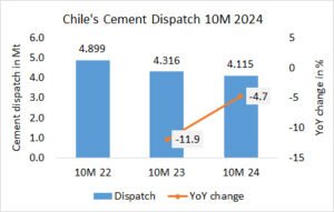 In the first 10 months in 2024, Estonia’s cement production declined by -6.5% to 159 kt, after 170 kt in the same period last year and 230 kt in the year before.