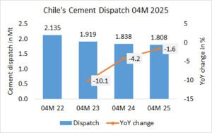 In the first 4 months in 2025, the ex-works average cement prices in Germany (calculated from cement sales volumes and cement T/O) decreased by -3.9% YoY to 115.57 €/t, after 120.33 €/t in the same period last year and 118.48 €/t in the year before.