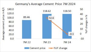 In the first 7 months of 2024, Germany’s cement production declined by -9.6% to 13.810 Mt, after 15.271 Mt in the same period last year and 17.767 Mt in the year before.