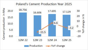 In the first 11 months in 2025, Germany’s cement production increased by +0.4% to 22.849 Mt, after 22.754 Mt in the same period last year and 24.090 Mt in the year before.