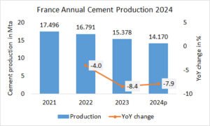 The preliminary annual cement production in Italy declined by -0.6% to 18.701 Mta, after 18.815 Mta in the last year and 18.797 Mta in 2022.