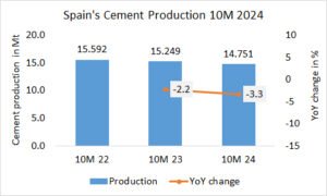 In the first 9 months in 2024, Italy’s cement production decreased by -0.2% to 13.905 Mt, after 13.935 Mt in the same period last year and 14.228 Mt in the year before.