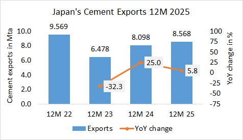 In the year 2025, Japan’s cement exports increased by +5.8% to 8.568 Mta, after 8.098 Mta in 2024 and 6.478 Mta in the 2023.
