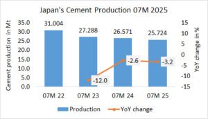 In the first 7 months in 2025, Japan’s cement exports increased by +7.8% to 4.914 Mt, after 4.559 Mt in the same period last year and 3.542 Mt in the year before.