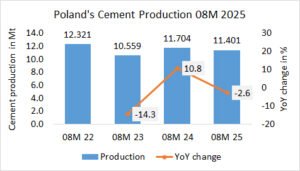 In the first 8 months in 2025, Japan’s cement production decreased by -2.8% to 29.339 Mt, after 30.175 Mt in the same period last year and 30.977 Mt in the year before.