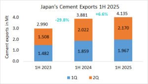 In the first half of 2025, Japan’s cement production decreased by -3.3% to 21.988 Mt, after 22.745 Mt in the same period last year and 23.284 Mt in the year before.