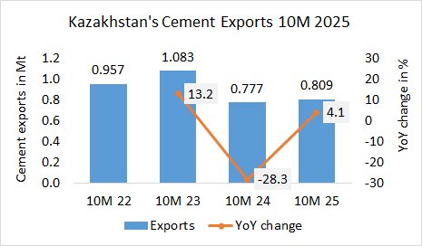 In the first 10 months in 2025, Kazakhstan’s cement exports increased by +4.1% to 0.809 Mt, after 0.777 Mt in the same period last year and 1.083 Mt in the year before.