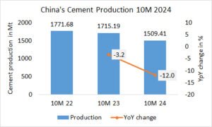 In the first 10 months in 2024, Kazakhstan’s cement production declined by -0.6% to 10.628 Mt, after 10.694 Mt in the same period last year and 10.863 Mt in the year before.