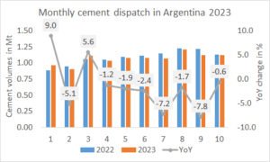 In Kenya in the first 7 month of 2023 the cement net trade increased by +33.9% to 0.237 Mt. After several years of being a cement importer the country is now a cement exporter. However, imports and exports are not very stable, which can be seen from the monthly fluctuations of the net trade.