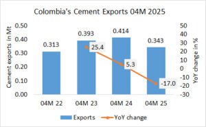 Mexico’s Cemex consolidated grey cement volumes declined by about -2% YoY in 1Q 2025, while the grey cement prices in local currency (based on FOB prices) increased by +2% YoY, with -7% YoY in US$ currency. Largest relative volumes were lost in Mexico, while largest volume gains and price increases could be achieved in the Middle East Africa business area.