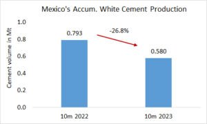 Mexico’s accumulated grey cement production increased by +1.8%, YoY, to 34.597 Mt from January to October 2023. In October, 3.536 Mt grey cement were produced, this is -2.2% compared to 3.615 Mt produced in October last year.