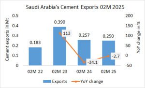 In the first quarter (1Q) 2025, Morocco’s cement dispatch increased by +4.5% to 3.382 Mt, after 3.235 Mt in the same period last year and 3.247 Mt in the year before.