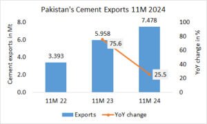 In the first 11 months in 2024, Pakistan’s cement dispatch declined by -5.0% to 40.198 Mt, after 42.316 Mt in the same period last year and 43.318 Mt in the year before.