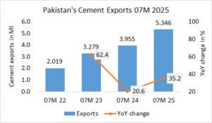 In the first 7 months in 2025, Pakistan’s cement dispatch (local and exports) increased by +8.3% to 26.506 Mt, after 24.481 Mt in the same period last year and 26.050 Mt in the year before.