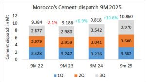 In the first 9 months in 2025, Pakistan’s cement dispatch (local and exports) increased by +8.8% to 34.602 Mt, after 31.872 Mt in the same period last year and 34.382 Mt in the year before.