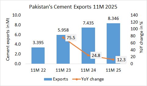 In the first 11 months in 2025, Pakistan’s cement exports increased by +12.3% to 8.346 Mt, after 7.435 Mt in the same period last year and 5.958 Mt in the year before.