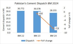 In the first 8 months of 2024, Pakistan’s cement exports increased by +15.1% to 4.614 Mt, after 4.009 Mt in the same period last year and 2.405 Mt in the year before.