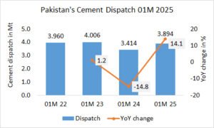 In January 2025, Pakistan’s cement exports increased by +31.2% to 0.522 Mt, after 0.398 Mt in the same period last year and 0.418 Mt in the year before.