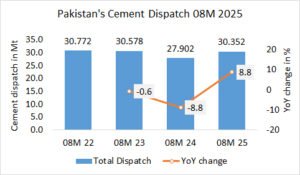 In the first 8 months in 2025, Pakistan’s cement exports increased by +33.4% to 6.096 Mt, after 4.569 Mt in the same period last year and 4.009 Mt in the year before.
