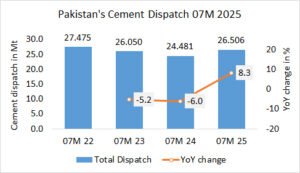In the first 7 months in 2025, Pakistan’s cement exports increased by +35.2% to 5.346 Mt, after 3.955 Mt in the same period last year and 3.279 Mt in the year before.