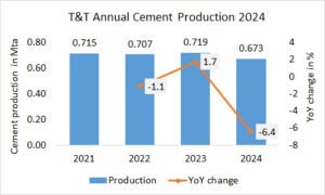 The annual cement production 2024 in Panama decreased by -9.1% to 1.265 Mta, after 1.391 Mta in the last year and 1.363 Mta in 2022.