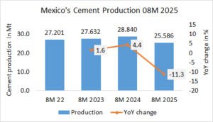 In the first 8 months in 2025, Panama’s cement production has been stable at 0.876 Mt, exactly the same amount as in the first 8 month last year, but lower than the 1.007 Mt in the year before.