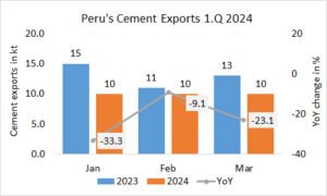 In the first quarter of 2024, cement production in Peru declined by -2.9% to 2.611 Mt, after 2.690 Mt in the same period last year. The YoY decline in March has been -2.8%, close to the 1.Q average.