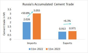 In Russia, in the period from January to November 2023, the cement production increased by 3.55% to 59.526 Mt, after 57.485 Mt in same period last year. In November the production increased by 11.1% YoY to 4.055 Mt.